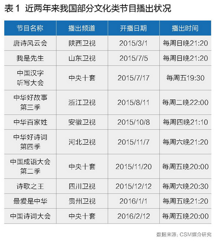 正当此时,文化类电视节目大量出现,丰富了电视节目内容,也净化了荧屏生态。比如,浙江卫视推出的《中华好故事》以中华传统故事为主要内容,用知识竞赛、故事演绎、名人出题、知名校友助阵等方式,普及中华传统故事相关知识;贵州卫视的《最爱是中华》利用竞赛的方式,普及传统文化,试图解开国学密码。此外,还有河北卫视的《中华好诗词》、陕西卫视的《唐诗风云会》,带领观众穿越历史,感受传统诗词之美;《中国汉字听写大会》等字词类节目同样融入了夺冠元素,让知识类节目变得好听好看,更成为中小学语文教学的第二课堂。