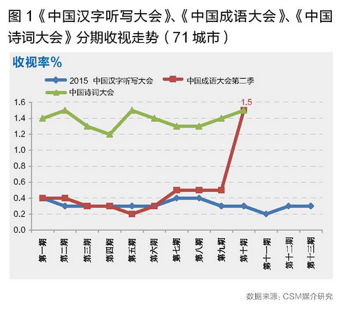 《中国成语大会》是继《中国汉字听写大会》之后,又一档拥有重大影响力的大型电视文化节目,于2014年4月18日起登陆央视,每周五晚八点在中央电视台科教频道播出,是中央电视台2014年的重点节目。 与《中国汉字听写大会》相比,《中国成语大会》在保留相似竞赛形式的基础上,融入了更多独特多元的创新构思,并力邀毕淑敏、蒙曼、郦波等多位重量级文化名人担任评判嘉宾,希望能够细致地展现中国成语独有的语境之美。2015年2 月1 日,《中国成语大会》第二季总决赛完美收官,在当晚播出的央视网络春晚、《少帅》等热门晚会、电视剧的竞争下,《中国成语大会》第二季总决赛在71大中城市组合的收视率飙升至1.5%,当晚同时段市场份额达到4%(图1)。