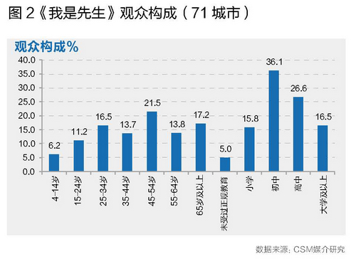 《我是先生》是一档特殊的“真人秀”节目,它杂糅了演讲、访谈、表演等多种节目元素,如“好学团”嘉宾的对话和相声演员高晓攀的相声推介,使节目本身表现出“混搭”的特点,山东卫视当家花旦董姝的主持风格,也为节目增色。《我是先生》在节目形态上有多种探索和创新,增加了节目的丰富性和可看性。从收看该节目观众的年龄构成情况可以看出,除了45-54岁以及65岁以上的中老年观众是该节目的主要构成人群外,该节目也同样吸引了不少25-34岁的青年观众的眼球(图 2)。