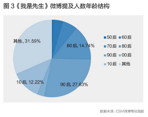 另一方面,微博平台已经成为各类电视节目与用户沟通的重要渠道,在微博平台参与讨论《我是先生》的人群中,90后成了主力军,占到所有在微博中提及该节目人数中的27.8%。可见《我是先生》确实收获了不少年轻观众的关注(图 3)。