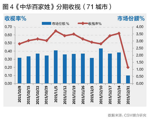 《中华百家姓》自第一期“赵”姓开始,便引发了收视小高潮,该节目首播当晚的收视份额位在同时段所有省级卫视播出的节目中排名第四。而在节目播出到第五期的“周”姓专场时,当晚的收视率为0.65%,市场份额2.34%,在同时段所有省级卫视播出的节目中份额排名第二位(图 4)。
