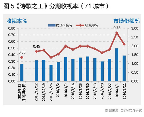 从收视成绩上看,首期节目于周六晚20:30分开播,0.45%的收视成绩虽然不比那些用明星造势的真人秀节目,但相较于本频道上月晚间同时段的平均收视率,还是有了25%的收视提升。不同主题赛的顺序推出让节目收视渐入佳境,前八期播毕,从第九期开始,四川卫视将《诗歌之王》调至19:35分播出,直接迎战各大综艺真人秀,越战越勇的《诗歌之王》似乎已经找到了自己的节奏,而其他文化类节目,尤其是诗词类节目的制作模式也在观众的反馈中找到了一条可以借鉴的道路(图 5).