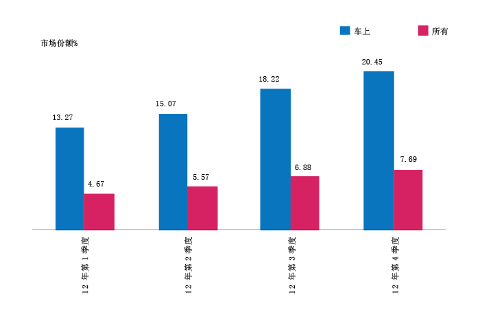 上海交通广播是上海唯一一家定位于交通收听人群的专业广播频率,如何抓住广播市场的大好机会,对于上海交通广播来说考验重重。2011年,上海交通广播结束了份额连续两年上涨的趋势,从2010年的5.63%,下降至2011年的4%,降幅近30%;车上收听份额从21.8%降至13.9%,降幅达36%(图1)。这一切决定了改变势在必行,2012年1月2日,上海交通广播"换颜"亮相,从节目版面到频率口号都发生了变化,到2012年底,交通广播的份额从第一季度的4.67%增长到年底的7.69%,增幅达65%,收听排名也从2011年的第9位,逐步上升到2012年年底的第5位,在上海所有广播频率中独树一帜。上海交通广播是如何在一年中实现如此大踏步的跨越呢?