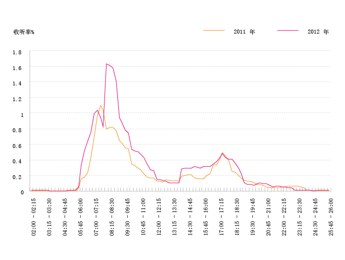 对比2011年和2012年交通广播收听曲线发现,改版一年后,交通广播早间收听大幅度提升,8:00-9:00收听率提升接近一倍,实现了将整体市场早间次高峰转变为交通广播的主高峰,而6:00高峰起始点也以更快的速度和更大的幅度拉升整个早间收听率。在这一年中,早高峰收听的逐步上升,最终对全天收听做出更大贡献(图3-4,表1)。