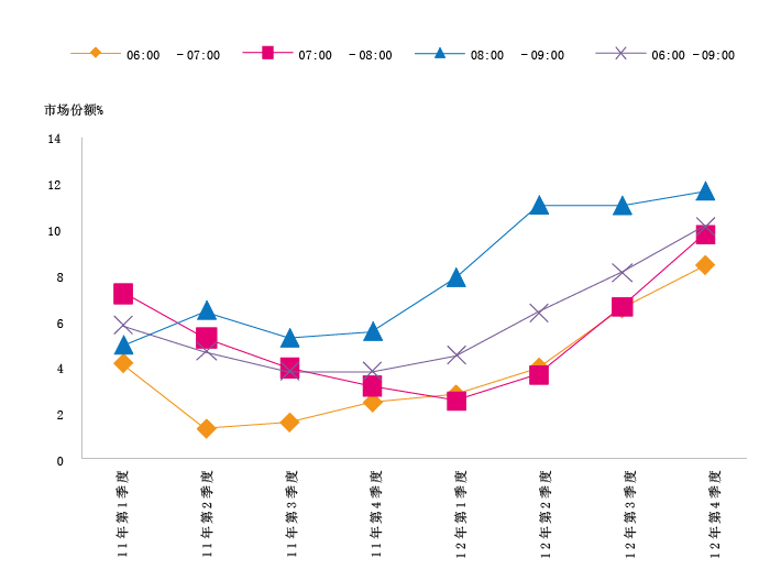 早间时段历来是广播兵家必争之地,特别对于交通广播来说,早晚高峰正是移动人群路上收听最集中的时段,但2011年交通广播早晨6:00-9:00市场份额已逐渐降至第7位,在SMG12套频率中屈居中游。分析早晨6:00-9:00听众收听的规律可以发现,虽然由于年长听众的带动,全体听众早间收听高峰出现在7:00-8:00间,但是对于25-44岁人群而言,8:00-9:00的收听高峰势头仍强劲维持,而这部分人群正是交通广播的目标听众,另一方面,早高峰上升的趋势从6:00已开始形成,如何在收听高峰形成时迅速聚拢听众,在8:00-9:00的次早高峰把握住目标听众,是提升收听的关键(图2)。