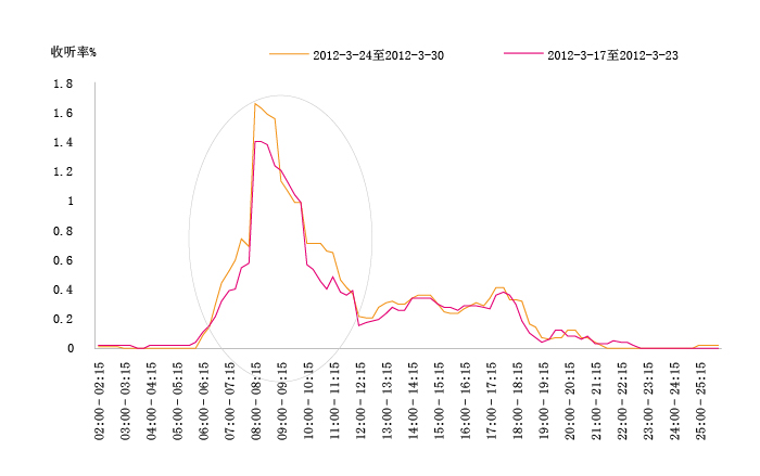 2012年交通广播加大了路况播报的力度,为了应对随时发生的事件,实现报道方式"边发生、边发展、边发现、边报道"的模式转变,交通广播于2011年11月成立了路况报道特别行动队,在春运、中小学校开学日、吴淞大桥封闭施工、清明祭扫等重大交通时间节点以及行人翻越高架、道路车辆自燃等突发交通事件发生时,亲赴现场,为听众带来第一手的报道。目前的路况报道通过"交通警察"权威播报、"路况宝贝"个性播报、"特别行动"抢先直击突发事件等举措实现全方位的交通资讯发布。在特别报道密集的时期,收听也不同程度得到了提升,以3月24日清明前的第一波祭扫为例,记者们在地铁、墓区、短驳车站、公路网管理中心等发回第一手现场报道,当周收听较上周相比增长12%,特别在中午之前时段尤为明显(图5)。