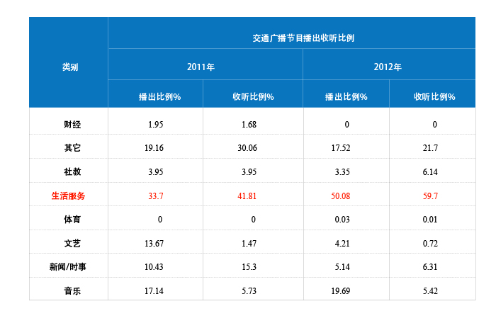 生活服务节目是交通广播改版后的另一块重头戏,2011年交通广播生活服务类节目占全频率的33.7%,而收听比例达到41.81%,显然交通广播的听众对生活服务类节目有着较强的收听需求。2012年,生活服务类节目占到交通广播播出比例的50%,听众的收听比例也达到了59.7%,频率提供的节目进一步满足了听众的收听需求,反过来也强化了听众对交通广播的选择(表2)。