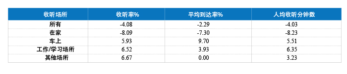 表1 全国33城市组合不同收听场所2011 / 2012年主要指标升降幅度