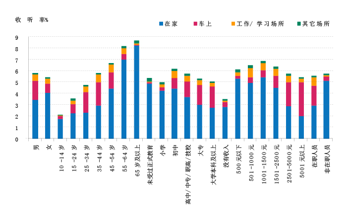 除了总量的变化,受众的结构分化更加显著,区隔非常明显。在家户内的听众,基本上以中老年为主,女性居多,受教育程度低,收入较少的退休人员为主;而车上、工作/学习场所中,以男性、中青年、受教育程//收入较高的职业人群为主。在不同场所收听广播的听众清晰地反映出差异化趋势,区隔明显(图1)。