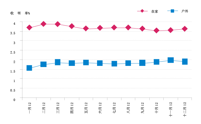 图2 2012年全国21连续城市组家户内、外月度收听率走势