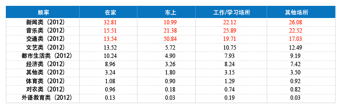 表2 2012年各类频率在不同收听场所的市场份额%