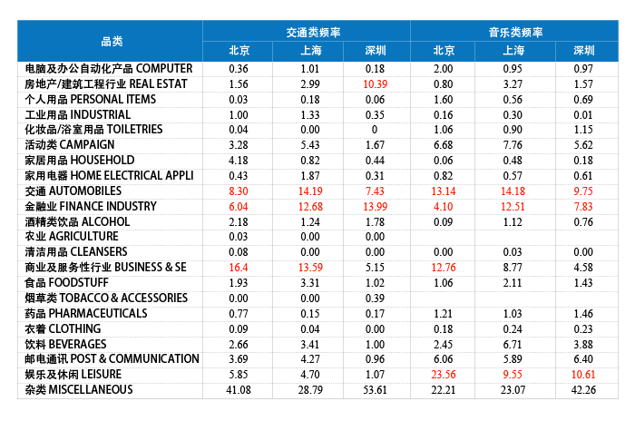 进一步洞察三个城市中交通类和音乐类频率所吸纳的广告品类,我们不难发现:三个城市有趋同的特征,但是又有差别。趋同的特征是在三所城市里的交通类广播中,"商业/服务性行业"、"交通类"、"金融"广告都处于投放量的前三位;音乐类广播中,"娱乐及休闲"、"商业/服务性行业"或"交通类"处于前两位。我们具体观察各个城市的情况,北京广播市场中,交通类频率吸纳的投放量较大的广告依次为"商业及服务业"、"交通类"和"金融业";音乐类广播中"娱乐及休闲"类的比重最高,"商业/服务性行业"、"交通类"比重相近,接下来"邮电通讯"、"活动类"占据较高比重。上海市场中,投放交通类广播其他比重较高的品类依次为:"交通类"、"商业及服务业"和"金融业"等;音乐类频率吸纳的主要广告依次包括:"交通"、"金融业"、"娱乐休闲"等;深圳市场中, 交通类频率吸纳的其他广告投放量较多的广告主要有"金融业"、"房产/建筑工程行业"、"交通"和"商业及服务行业"等;音乐类频率的主要广告还包括: "娱乐休闲"、"交通"、"金融"等。无论是交通频率还是音乐类频率,其吸纳的投放量比重较大广告类型具有高度的趋同性,说明这些品类的广告主对这两类广播频率的高度认同(表3)。