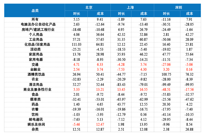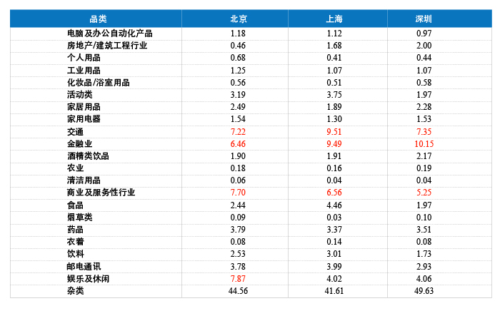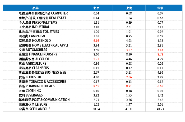 表5 2012年三大城市不同品类广告投放量比重(%)