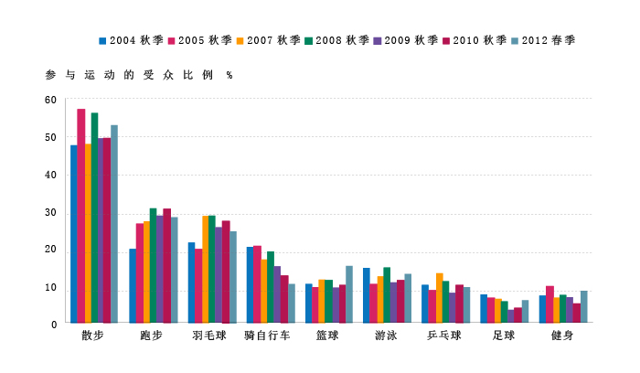 首先,我们很欣喜地看到中国人开始越来越多地参与体育锻炼,而且是参与到真正的体育锻炼中去,中国人开始更多地参与"团队锻炼",比如羽毛球、篮球、足球等。而其中奥运会的作用功不可没。对比历年的数据可以看到中国城市人口的体育锻炼呈以下状态(图1):第一,奥运会激发了人们体育锻炼的热情,2008年受众的体育锻炼频次最高;第二,散步仍是中国人最常参与的体育锻炼方式,而我们把这种体育锻炼视为"伪"运动,将散步视为日常体育锻炼方式的人中老年人的比例相对较高;第三,羽毛球和跑步作为城市人较喜欢的体育锻炼,近年来呈递长趋势,中国运动员在田径和羽毛球项目上的优秀表现无疑起到了良好的推动作用;第四,自行车运动表面上看来在近年来呈下降趋势,其实是因为在以前自行车更多地被当作交通工具,而现在我们看到的是真正参与自行车运动锻炼的人群;第五,足球市场的不景气导致踢足球的人在减少,但有趣的现象是自2009年开始,踢足球的人开始增加,也是2009年开始足球市场开始复苏,由此可见体育市场也会影响人们的体育锻炼方式;第六,游泳运动是另一个和奥运有很强关系的运动,从调研数据中可以看到,每逢奥运会后,通过游泳进行体育锻炼的比例都在增加,虽然2012年伦敦奥运会后的调研尚未完成,但我们相信孙杨等游泳运动员在奥运中的优秀表现,无疑会对游泳锻炼起到推动作用。