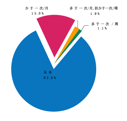 图2 过去十二个月体育受众现场观赛频次分布(2012年19大城市,15-54岁体育受众)