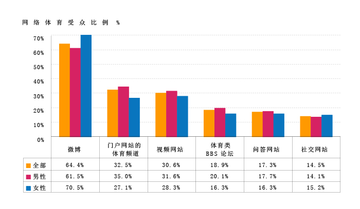 图4 体育受众获取体育信息的网络渠道分布(2012年19大城市,15-54岁体育受众)注:总体为使用互联网接触体育信息的体育受众。