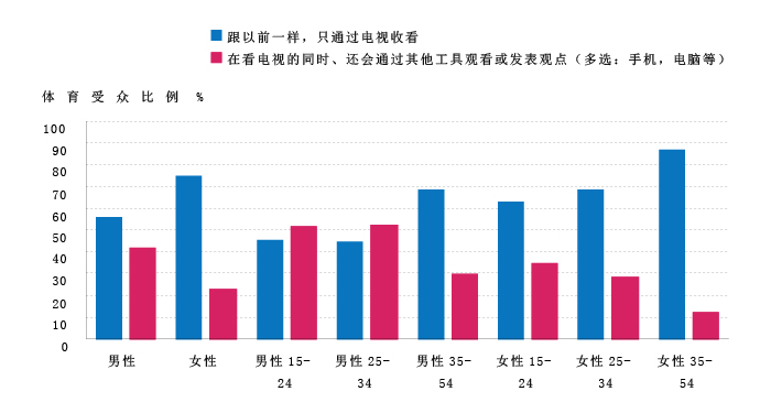 电视依然是受众观看奥运赛事的主流媒介,互联网成为奥运沟通平台。由于最新一次的调查是在2012年的春季,当我们问受访者对伦敦奥运的观赛预期时,98.8%的体育受众表示将通过电视观看伦敦奥运比赛,其中34.4%的体育受众表示将在伦敦奥运期间在"看电视的同时,还会通过手机、电脑等其他工具观看或发表观点"。对比选择只通过电视欣赏奥运和看电视同时通过其他渠道观看和发表意见的人可以看到:15-34岁男性更喜欢通过高科技工具发表自己的意见,而女性更倾向于以观赛为主(图5)。