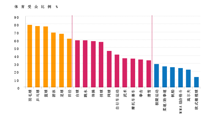 我们根据他们对不同体育项目的感兴趣程度的差异,将体育项目分为了三大级别,第一级别是羽毛球、乒乓球、篮球、游泳、足球、田径;第二级别是台球、跳水、体操、排球、网球等;极限运动、帆船等为第三级别。通过2012年春季的调查结果可以看出(图6):中国人不仅对传统的体育项目,比如羽毛球、乒乓球、篮球、足球等非常感兴趣,同时对赛车、滑雪、极限运动等新运动也非常感兴趣。这里还有三个项目值得特别指出:第一,台球:由于丁俊晖的良好表现使得中国人对台球感兴趣程度提升很快,虽然台球赛事在国际上依然属于一个小众的赛事,但在中国的"粉丝"众多,是近年来受众感兴趣度提升最快的体育项目。第二,田径:在我们刚刚开始调查的时候中国人对田径并不感兴趣,但由于刘翔的出现使得中国人对田径的感兴趣程度增加了很多。第三,网球:中国网球赛事的电视播出量很大,但除了少数有知名球星参与的顶级赛事的收视率相对较好以外,网球赛事的收视表现不是很好。目前为止中国的网球市场发展还不成熟,虽然有李娜这样知名的球星会助力网球的发展,但由于这还是一项新运动,让受众真正地理解并喜爱网球尚需比较长的一段时间。