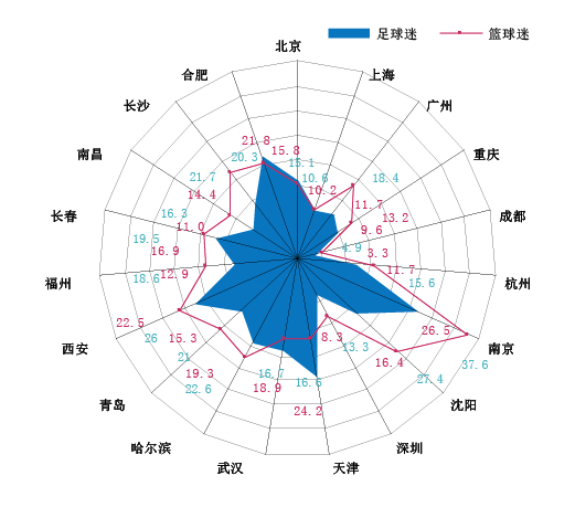 图7 2012年中国19大城市足球迷和篮球迷分布(15-54岁体育受众)