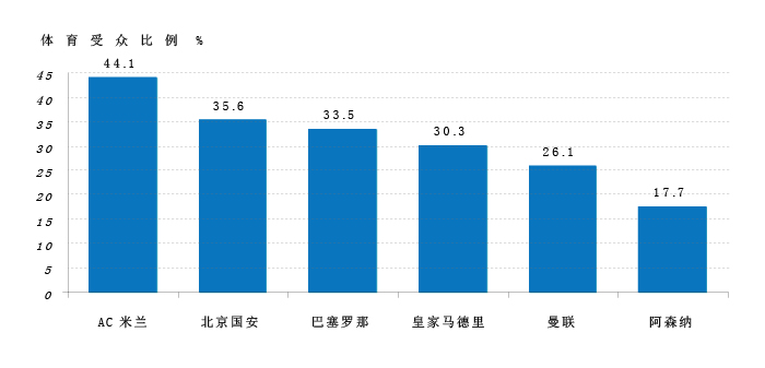中国体育受众多元化不仅体现在不同城市之间,甚至在同一城市体育受众的感兴趣度也是多元化的。以北京为例,当问及北京体育受众最喜爱的足球俱乐部,AC米兰排名第一,其次是北京国安,再次是巴塞罗那、皇马和曼联(图8)。北京的体育受众在喜爱自己本土足球俱乐部的同时,对国际足球知名俱乐部的喜爱度也非常高。北京国安俱乐部虽然拥有天时地利人和的优势,但仍排在拥有众多大牌球星的AC米兰之后,由此可见比赛成绩、球星等都是吸引球迷的利器。