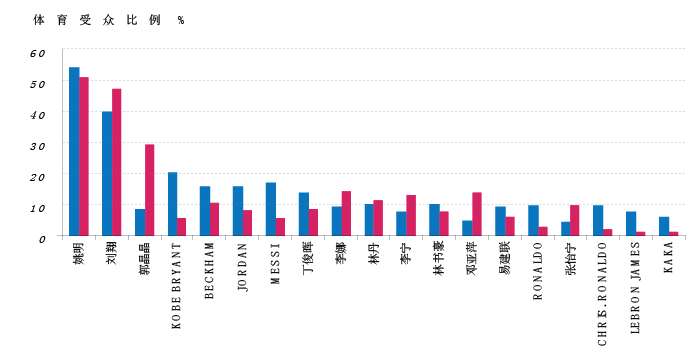 虽然中国人对国际体育赛事拥有非常高的感兴趣度,但当问及他们最喜爱的体育明星时,他们更倾向选择中国的本土明星,而且更有趣的是女性比男性更喜爱中国明星(图9)。姚明、刘翔和郭晶晶是最受欢迎的体育明星,科比、贝克汉姆、乔丹、梅西等是最受欢迎的外国体育明星。男性和女性体育受众对明星的喜爱度很大的差别:刘翔、林丹、李娜、李宁、邓亚萍的女"粉丝"居多,郭晶晶的女"粉丝"数量远远超过了男"粉丝",而巨星姚明、科比、贝克汉姆、罗纳尔多的男球迷数量多高于女球迷。同时,在中国受欢迎体育明星的"老龄化"也是一个值得重视的现象:乔丹、邓亚萍、李宁等老牌体育巨星依然榜上有名,姚明、郭晶晶、张怡宁等已经退役,丁俊晖、梅西、林丹等也已在体坛多年,只有李娜、林书豪是相对的"新星"。在伦敦奥运会上,中国的体育健儿创造了如此多的好成绩,如何将这些体育运动员塑造成体育明星是一个需要考虑的问题。