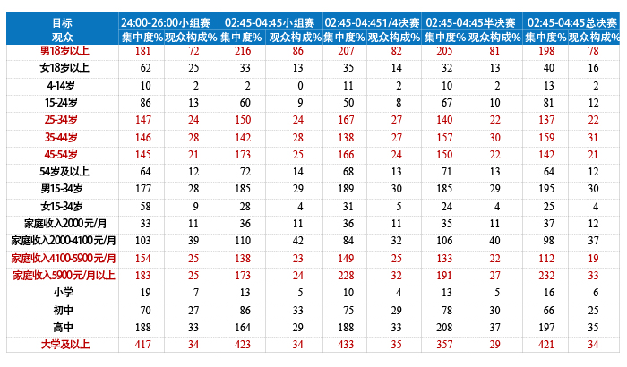 表1 中央台五套2012年欧洲杯直播比赛观众构成与集中度(所有省网)