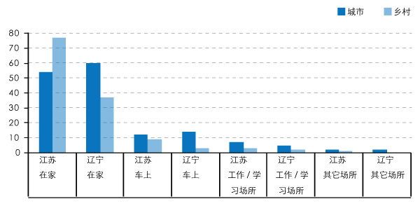 图1 2011年辽宁和江苏在不同场所的收听时长