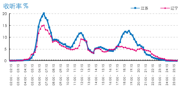 江苏省全天大部分时段的收听率都高于辽宁,尤其是在三次波峰时段。但辽宁省晚间的收听行为要比江苏省持久,从21:00开始一直到午夜,辽宁省的收听率普遍高于江苏,深夜的收听量相对较多(图2)。
