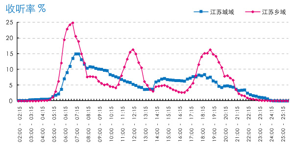 在江苏,城域和乡域的收听分钟走势存在明显的区别。在乡域,全天的三次收听波峰表现突出,最高峰出现在早晨7:00,峰值达到24.84%。中午和晚间的峰值相近。在城域,收听早高峰出现在7:30,比乡域晚半个小时,且高峰值只有14.98%,比乡域低了近10%,城域白天的收听走势相对平缓,中午和晚间也没有出现明显的收听波峰,但上午和下午工作时间的收听量要高于乡域。晚间城域的收听持续时间久,晚于乡域结束(图3)。