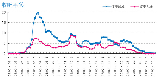 在辽宁,城域全天大部分时段的收听值都高于乡域,城域的收听主要集中在早晨,早7:00的收听率达到19.29%,中午和傍晚有小幅突起,但收听率都低于10%。乡域的收听最高峰是在中午12:30,收听率8.87%,其次是早晨6:30,收听率7.38%,晚间19:00-20:00期间,收听率略高于城域(图4)。