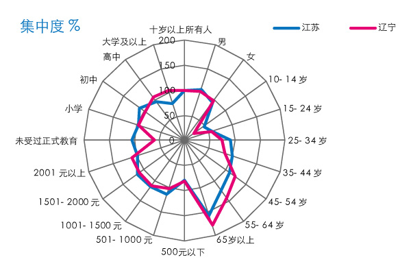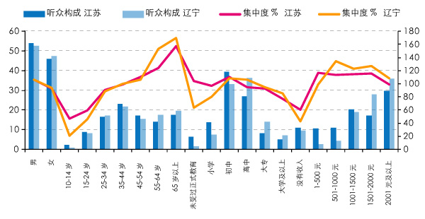 (三) 江苏年轻听众收听量更多,辽宁高教育程度听众集中度更高
