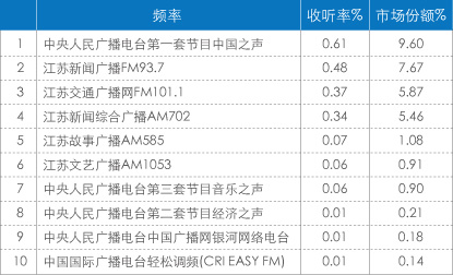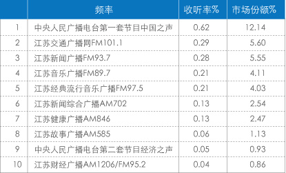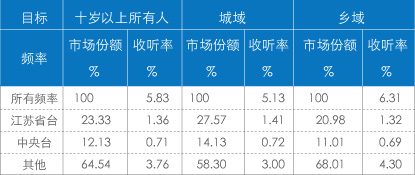 在江苏省,十岁及以上所有人平均收听率为5.83%,江苏台在全省获得23.33%的份额,超过中央台11.2%。在城域,省台的竞争力更强,份额为27.57%,比在乡域的份额高出6.59%。中央台在城域的份额也超过乡域。
