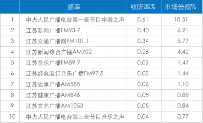 在江苏省台的10个频率中,有8个频率进入全省排名前十。排在第一位的是中央一套中国之声,收听率0.61%,份额10.51%,江苏新闻广播FM93.7以6.91%的份额排在第二位,居省台所有频率之首。江苏交通广播网FM101.1和新闻综合广播AM702处于第三位和第四位(表4)。