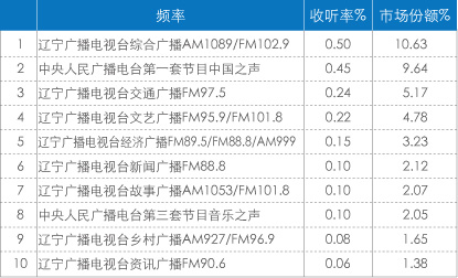 在辽宁省网,辽宁台占到将近三分之一的收听市场,中央台的份额为12.96%,在沈阳市,中央台的市场占有率略低于在省网,而辽宁台的市场占有率则达到47.09%,沈阳台份额略低,也达到42.37%,省台和省会台之间的竞争比较激烈。