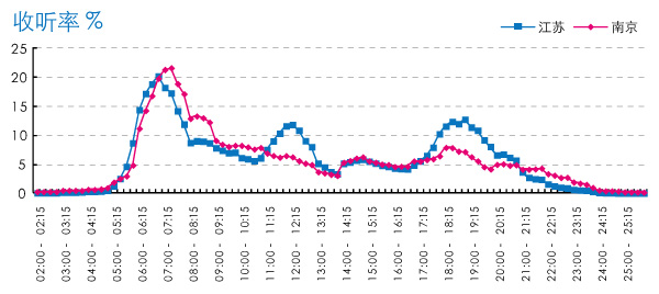 从全天收听走势来看,江苏在早晨、中午和晚间出现三次收听高峰,收听波峰明显。早晨7点左右达到全天的第一个收听高峰,之后下滑,约在中午11:00左右收听率开始上升,中午12:00获得第二次收听高峰,第三次高峰出现在晚上19:00,23:00之后基本上不再有听众收听广播。中午和晚间的收听波峰数值比较接近,晚间略高,且持续时间更长。