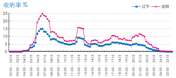 对比辽宁和沈阳,沈阳全天大部分时段的收听率都高于辽宁省网,收听行为不但开始的早,结束的也晚,在早晨和中午时段有明显的收听波峰,早晨7:00达到全天最高值,收听率24.91%,省网在同时段也达到全天的最高点,但收听率值只有15.09%,明显低于沈阳。在中午12:00-13:00,省网和市网的收听率都有所上升,获得各自的第二个收听波峰。省网从午后开始一直到晚间22:00,收听率走势平缓,波动较小。沈阳市在傍晚以及晚间21:00左右还有两次小的收听突起(图9)。