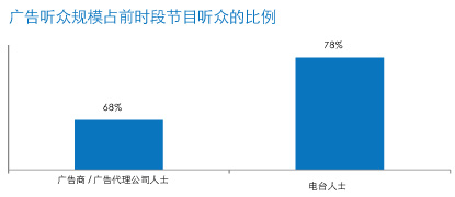 相比于此处的研究发现,往日人们对广告听众规模占前时段节目听众规模的比例要悲观的多。此前,广告商或广告代理公司的专业人士认为,广告听众的规摸仅占前时段节目听众的68%,而电台人士对这一比例的把握也仅有78%。