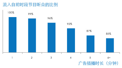 对于长度为一至三分钟的广告插播而言,其听众规模与广告插播前一分钟节目听众规模几近相同,对于那些长度达到4-6分钟的广告插播而言,其流入自前时段节目的听众比例也相当之高。
