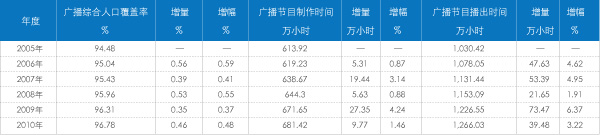 广播媒体作为历史悠久的传统媒体,在当今日新月异的媒介环境中,仍然是受众获取信息和娱乐的重要渠道之一,也是媒介经营者服务客户、赢取收益的重要媒介之一。国家广电局统计信息显示,2010年广播综合人口覆盖率为96.78%,尽管低于电视综合人口覆盖率,但近六年的覆盖率增长速度明显高于电视综合人口覆盖率。2010年全年广播节目制作时间为681.42万小时,全年广播节目播出时间为1226.03万小时,近六年来,呈现稳定增长的态势。可以说,广播媒介市场的制作和供应端经历了稳定的增长和发展历程(表1)。