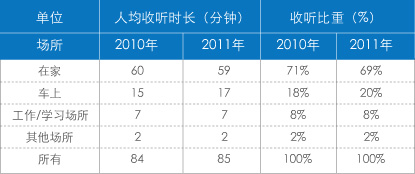 2011年数据显示,人均日收听分钟数为85分钟,较2010年增加1分钟。其中,在家人均收听量为59分钟,其收听比重较2010年有所降低,从71%降低到69%。而车上收听量和收听比重均较2010年数据有所提升,从2010年的15分钟计18%增加到2011年的17分钟计20%,可见广播收听量的些许增长主要是来自于车上收听的增长(表2)。