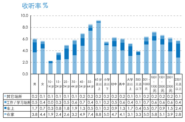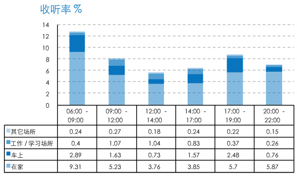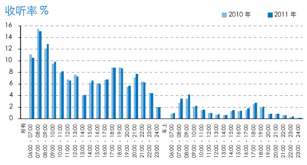 总体收听率数据显示,全天出现07:00-08:00、12:00-13:00、17:00-19:00和20:00-21:00四个相对收听率高峰。早高峰07:00-08:00时段收听率高达15%,晚间17:00-19:00时段收听率接近9%。所有场所收听率在上午08:00-11:00时段和晚间20:00-21:00时段较2010年有轻微提升。