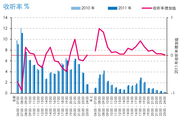 与2010年相比,在家收听的多数时段,总体收听率有明显下降,高峰时段06:00-07:00和17:00-19:00时段的收听率下降最为严重,仅在08:00-10:00、14:00-15:00和20:00-21:00时段,总体收听率有所增长,而在车上收听的所有时段,总体收听率呈现了明显的增长,且在07:00-09:00和17:00-18:00时段的收听率增长最为突出。这一变化反映了2011年中国广播收听市场收听结构的变化,全天绝大部分时段车上收听率提升明显,而高峰时段在家收听率降低和非高峰时段相对增长的情况(图2)。