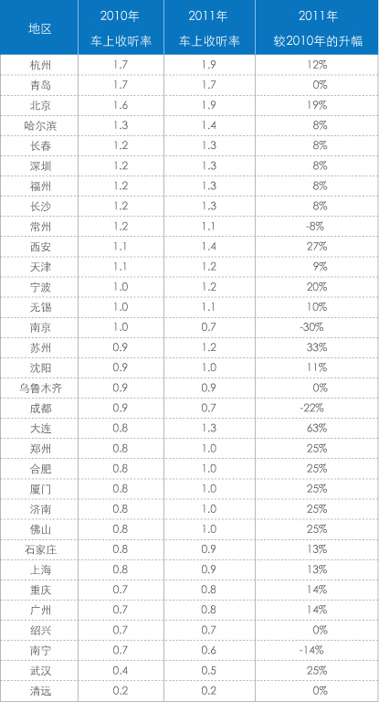 车上收听率相对较高的市场有杭州、北京、青岛、哈尔滨、长春、深圳、福州、长沙、西安、常州、天津、宁波和无锡。其中在西安、宁波、北京和杭州,车上收听率较2010年明显增加,而在常州,车上收听率则有小幅降低。在另外一些城市,如武汉、重庆、广州、石家庄、上海、郑州、合肥、厦门、济南、佛山、大连和苏州,车上收听率低于平均水平,但车上收听率较2010年有可观的增幅。可见车上收听市场的增长将更加依赖于“相对轻度”的车上收听市场(表3)。