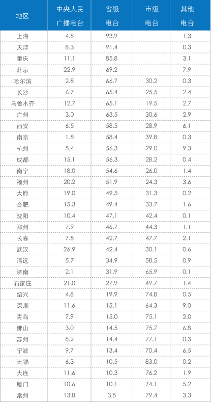 分城市来看,省级电台的竞争优势多体现于省会城市,如在上海、天津、重庆、北京、哈尔滨、长沙、乌鲁木齐、广州、西安、南京、杭州、成都、南宁和福州,该类电台的市场份额超过了50%,而市级电台则在无锡、常州、苏州、大连、佛山、青岛、绍兴、厦门、宁波、济南、深圳和清远等地领先,其市场份额超过50%,在无锡、常州、苏州、大连、佛山、青岛、绍兴和厦门,市级电台的市场份额更是超过70%。而中央台仅在武汉、北京、石家庄和福州获得超过20%的市场份额。省级电台和市级电台的市场份额呈现明显的此消彼长的竞争态势,听众群主要在这两大本地广播媒体间流动,广播媒体的地域性和贴近性特征,在本地广播媒体的竞争优势中得到了生动的体现(表4)。