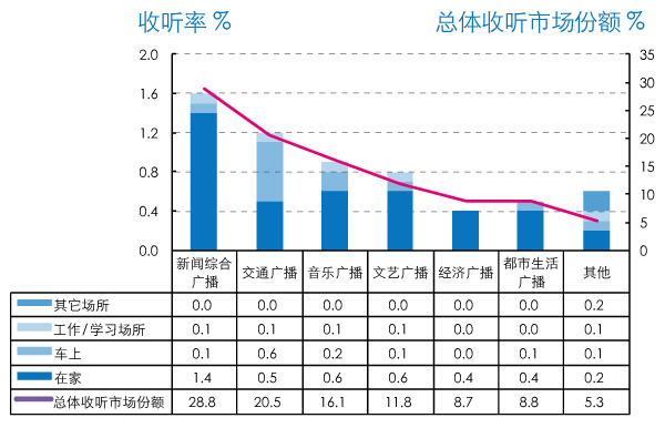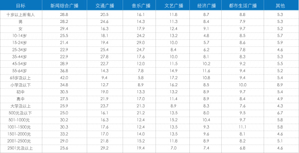 在以年龄段为细分标准的收听市场上,多数广播类别都表现出明显的年龄特征,新闻综合广播、文艺广播和经济广播在老年听众有较高的市场份额;交通广播在中青年听众(25-54岁)中市场份额较高,而音乐广播则在青少年听众(10-34岁)中市场份额较高。