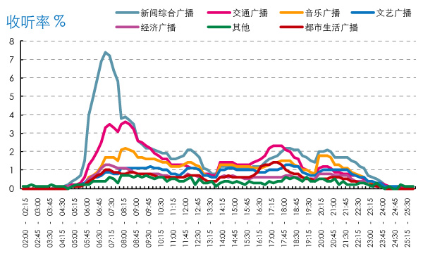 2、 总体收听率早高峰突出,高峰时段车上收听率进一步提升