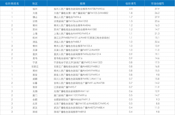 表6 收听率排名前三名的本地新闻综合广播频率(10+,全天时段)