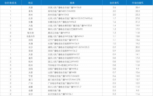 交通广播类频率仅次于新闻综合类广播频率,成为有较多频率成为本地频率收听率排名第一的广播频率类别。33个城市中,有10个城市的交通类广播频率在本地广播收听率排名中名列第一。天津台交通广播和青岛交通广播全天时段平均收听率超过2%,市场份额分别达到28%和33%(表7)。