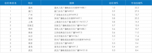在众多音乐广播频率中,也有较多频率跻身本地市场收听率排名前列,重庆台音乐频率、厦门音乐广播和广东电台音乐之声成为佼佼者,其在各自本地市场收听率排名第一。深圳台音乐广播和上海流行音乐广播等另外六个音乐广播频率分列当地市场收听率排名第二名(表8)。