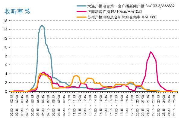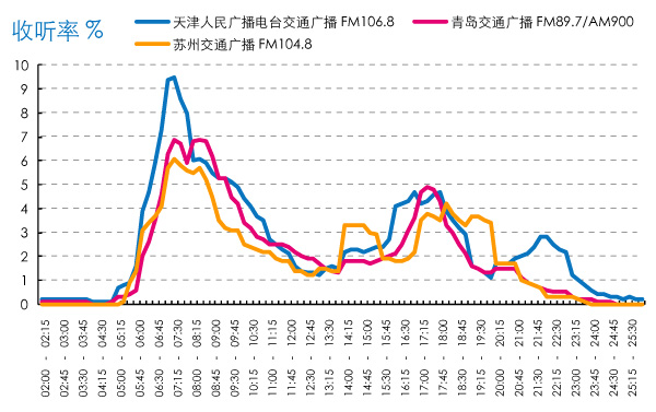 数据来源:CSM媒介研究天津台交通广播晚高峰16:00-17:00时段播出《打开晚报》,其子栏目包括晚报头条、晚报浏览、民生百态、热点扫描和大千世界等,期间插播交通路况。青岛交通广播晚高峰17:00-18:00时段播出《动感青岛下午版》。苏州交通广播则在14:00-15:00和17:30-18:30时段出现另外两个收听小高峰,期间分别播出《1048交通热线》和《高峰5、6点》,还是以路况等资讯为主(图8)。